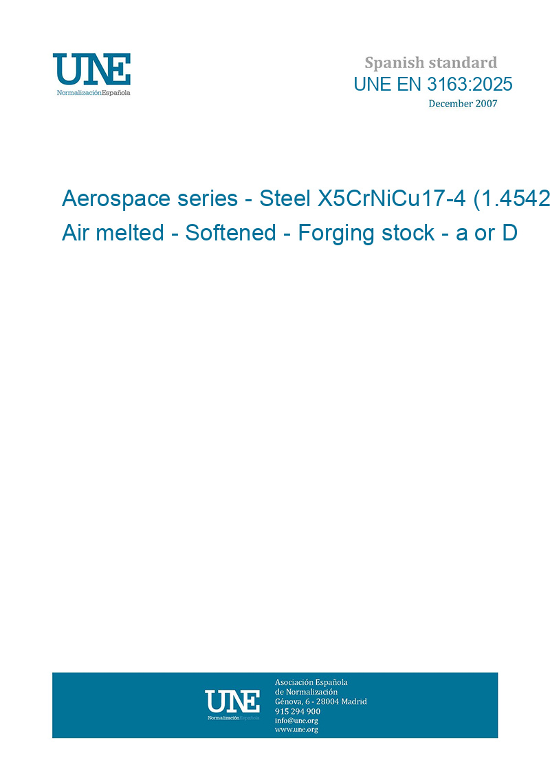 This standard UNE EN 3163:2025 Aerospace series - Steel X5CrNiCu17-4 (1.4542) - Air melted - Softened - Forging stock - a or D <= 300 mm (Endorsed by Asociación Española de Normalización in January of 2026.) is classified in these ICS categories: