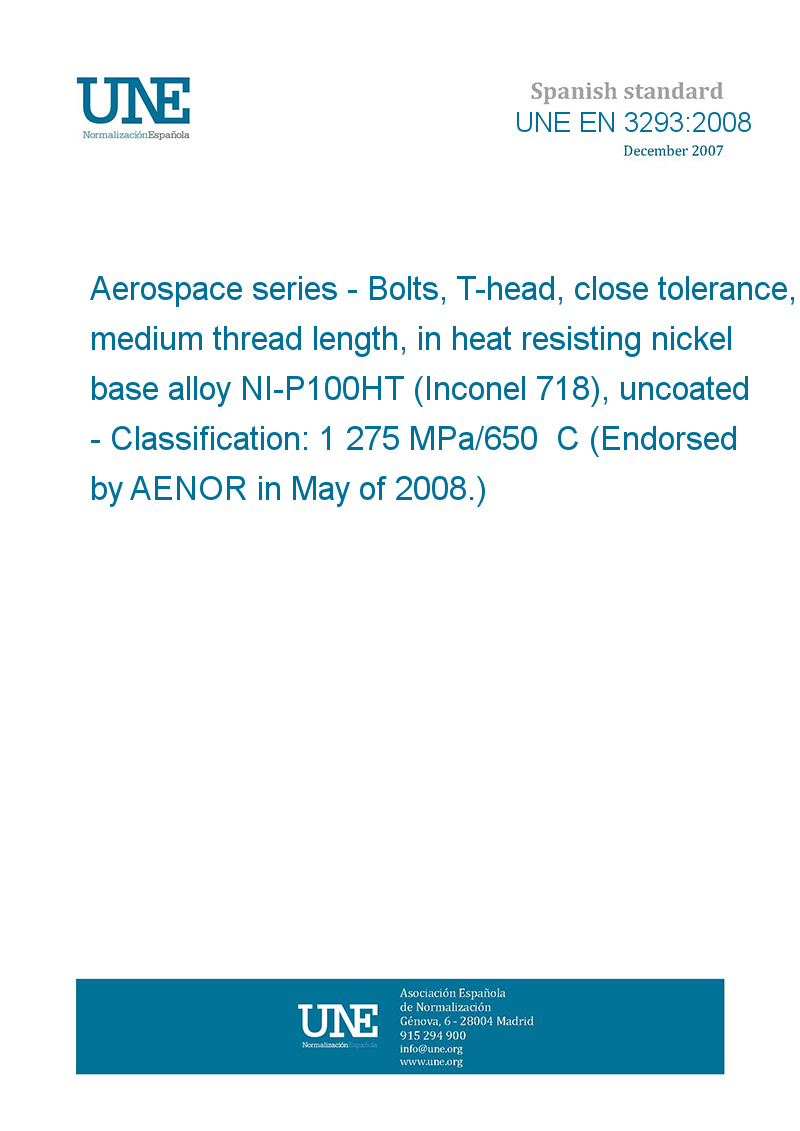 Material aeroespacial. Bulones de cabeza en T, tolerancia estrecha, rosca de longitud media, en aleación a base de níquel resistente al calor NI-P100HT (Inconel 718), no recubiertos. Clasificación: 1 275 MPa/650 °C (Ratificada por AENOR en mayo de 2008.)
