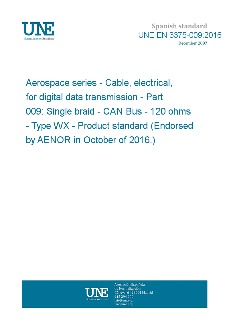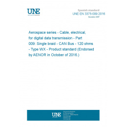 Aerospace series - Cable, electrical, for digital data transmission - Part 009: Single braid - CAN Bus - 120 ohms - Type WX - Product standard (Endorsed by AENOR in October of 2016.)