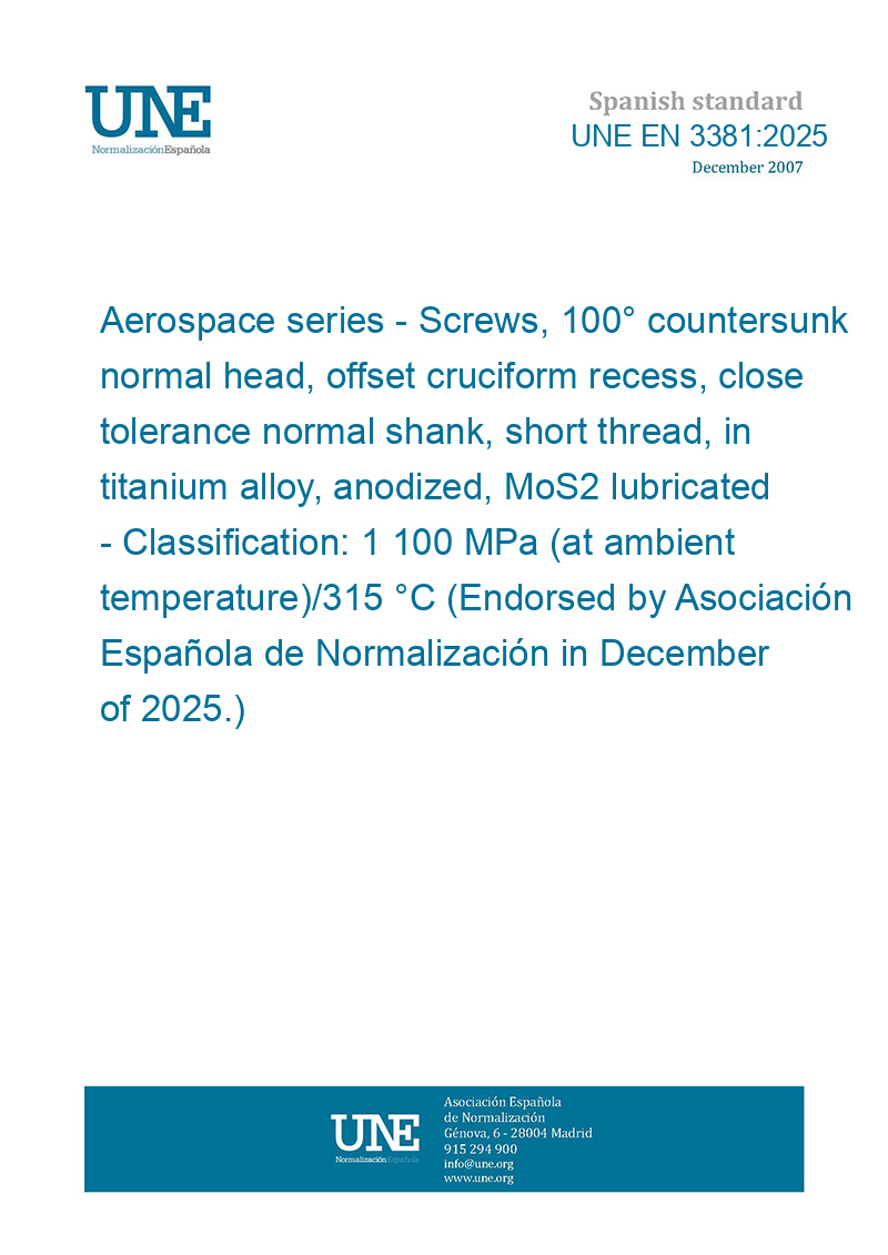 Aerospace series - Screws, 100° countersunk normal head, offset cruciform recess, close tolerance normal shank, short thread, in titanium alloy, anodized, MoS2 lubricated - Classification: 1 100 MPa (at ambient temperature)/315 °C (Endorsed by Asociación Española de Normalización in December of 2025.)