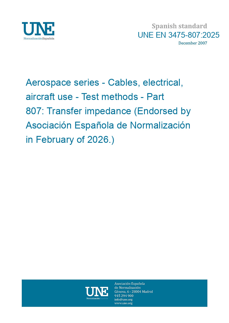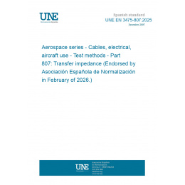 Material aeroespacial. Cables eléctricos de uso en aeronaves. Métodos de ensayo. Parte 807: Impedancia de transferencia. (Ratificada por la Asociación Española de Normalización en febrero de 2026.)