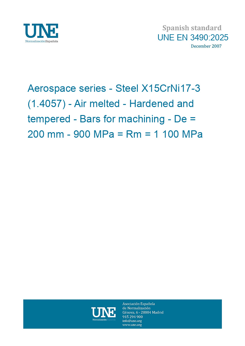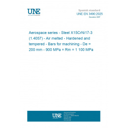 Material aeroespacial. Acero X15CrNi17-3 (1.4057). Fundido al aire. Templados y revenidos. Barras para mecanizado -De <= 200 mm - 900 MPa <= Rm <= 1 100 MPa (Ratificada por la Asociación Española de Normalización en octubre de 2025.)