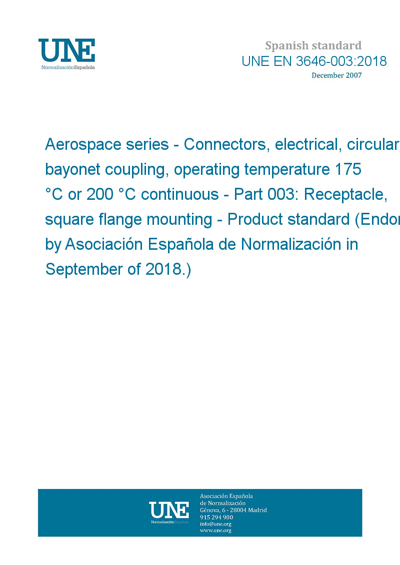 Material aeroespacial. Conectores, eléctricos, circulares, empalme de bayoneta, temperatura de funcionamiento 175 ºC o 200 ºC continua. Parte 003: Receptáculo, montado con brida cuadrada. Norma de producto (Ratificada por la Asociación Española de Normalización en septiembre de 2018.)