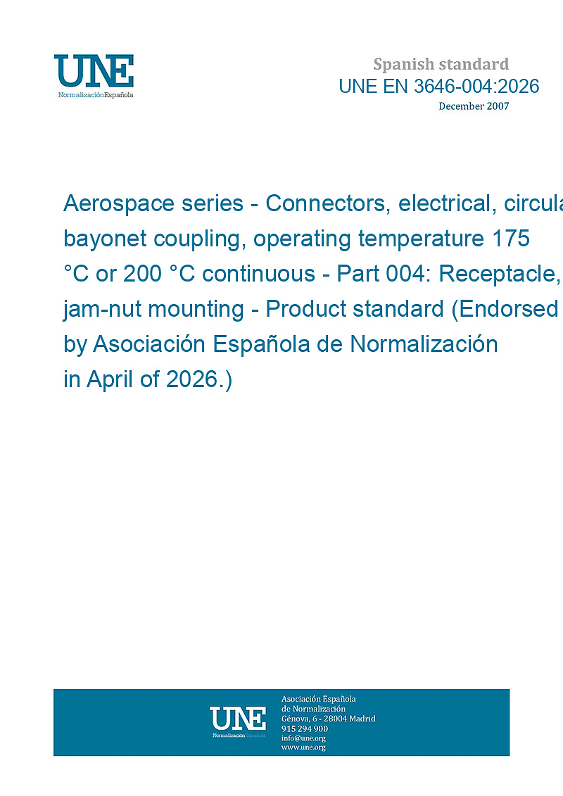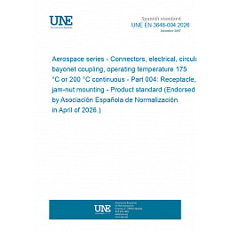 Material aeroespacial. Conectores, eléctricos, circulares, empalme de bayoneta, temperatura de funcionamiento 175 ºC o 200 ºC continua. Parte 004: Receptáculo montado con tuerca. Norma de producto (Ratificada por la Asociación Española de Normalización en abril de 2026.)