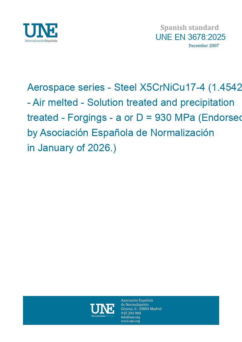Material aeroespacial. Acero X5CrNiCu17-4 (1.4542). Fundido al aire. Tratado en solución y precipitación. Piezas forjadas y piezas matrizadas -a o D <= 200 mm - Rm >= 930 MPa (Ratificada por la Asociación Española de Normalización en enero de 2026.)