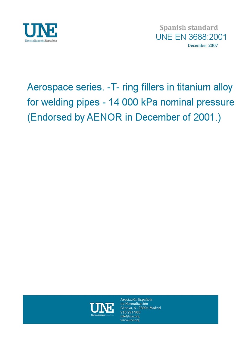 This standard UNE EN 3688:2001 Aerospace series. -T- ring fillers in titanium alloy for welding pipes - 14 000 kPa nominal pressure (Endorsed by AENOR in December of 2001.) is classified in these ICS categories: