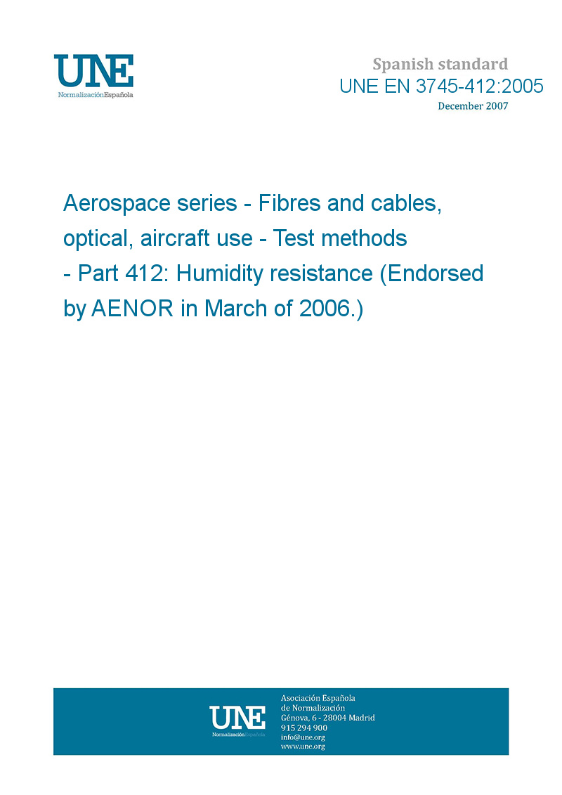 >UNE standards>UNE EN 3745-412:2005 Aerospace series - Fibres and cables, optical, aircraft use - Test methods - Part 412: Humidity resistance (Endorsed by AENOR in March of 2006.)