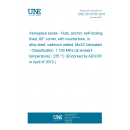 This standard UNE EN 3753:2010 Aerospace series - Nuts, anchor, self-locking, fixed, 60° corner, with counterbore, in alloy steel, cadmium plated, MoS2 lubricated - Classification: 1 100 MPa (at ambient temperature) / 235 °C (Endorsed by AENOR in April of 2010.) is classified in these ICS categories: