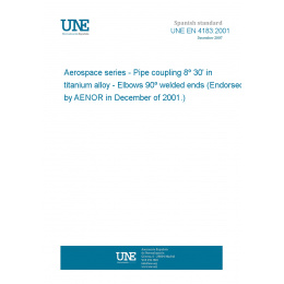 This standard UNE EN 4183:2001 Aerospace series - Pipe coupling 8º 30' in titanium alloy - Elbows 90º welded ends (Endorsed by AENOR in December of 2001.) is classified in these ICS categories: