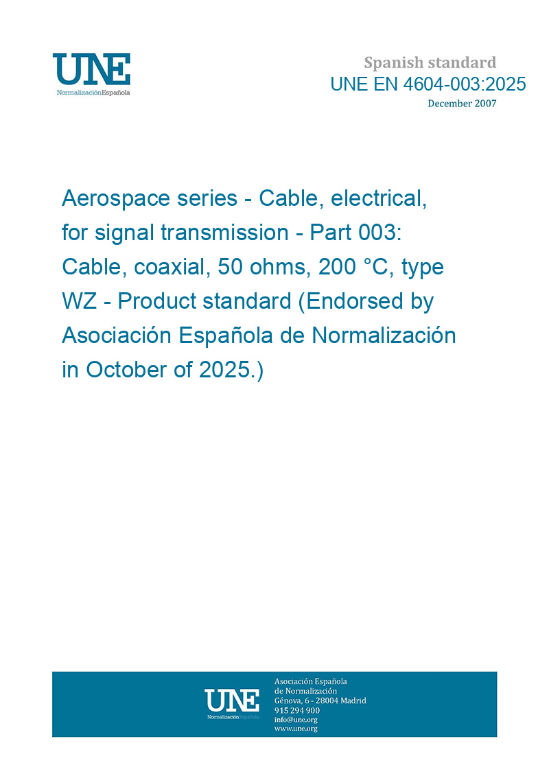 Material aeroespacial. Cables eléctricos para transmisión de señales. Parte 003: Cable, coaxial 50 Ohmios, 200 ºC, tipo WZ. Norma de producto (Ratificada por la Asociación Española de Normalización en octubre de 2025.)