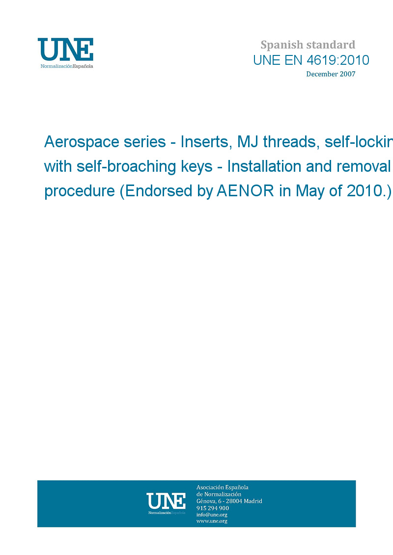 Material aeroespacial. Inserciones, roscas MJ, autofrenado, con clavijas auto-perforadoras. Procedimiento de instalación y extracción. (Ratificada por AENOR en mayo de 2010.)