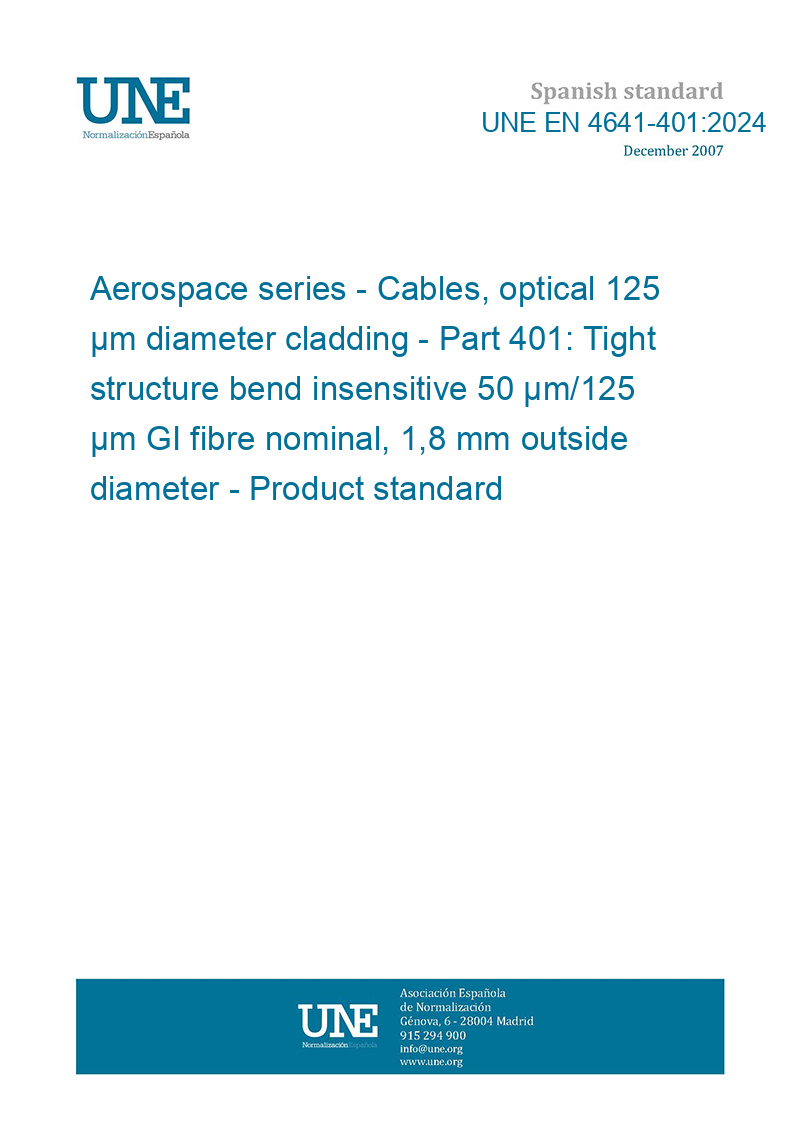 Material aeroespacial. Cable óptico, diámetro exterior de la funda óptica 125 µm. Parte 401: Cable de estructura ajustada, fibra de gradiente de índice 50/125 µm, insensible a la curvatura, diámetro exterior 1,8 mm. Norma de producto. (Ratificada por la Asociación Española de Normalización en noviembre de 2024.)