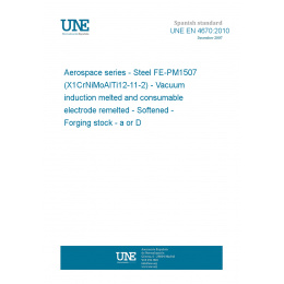This standard UNE EN 4670:2010 Aerospace series - Steel FE-PM1507 (X1CrNiMoAlTi12-11-2) - Vacuum induction melted and consumable electrode remelted - Softened - Forging stock - a or D <= 300 mm (Endorsed by AENOR in February of 2011.) is classified in these ICS categories: