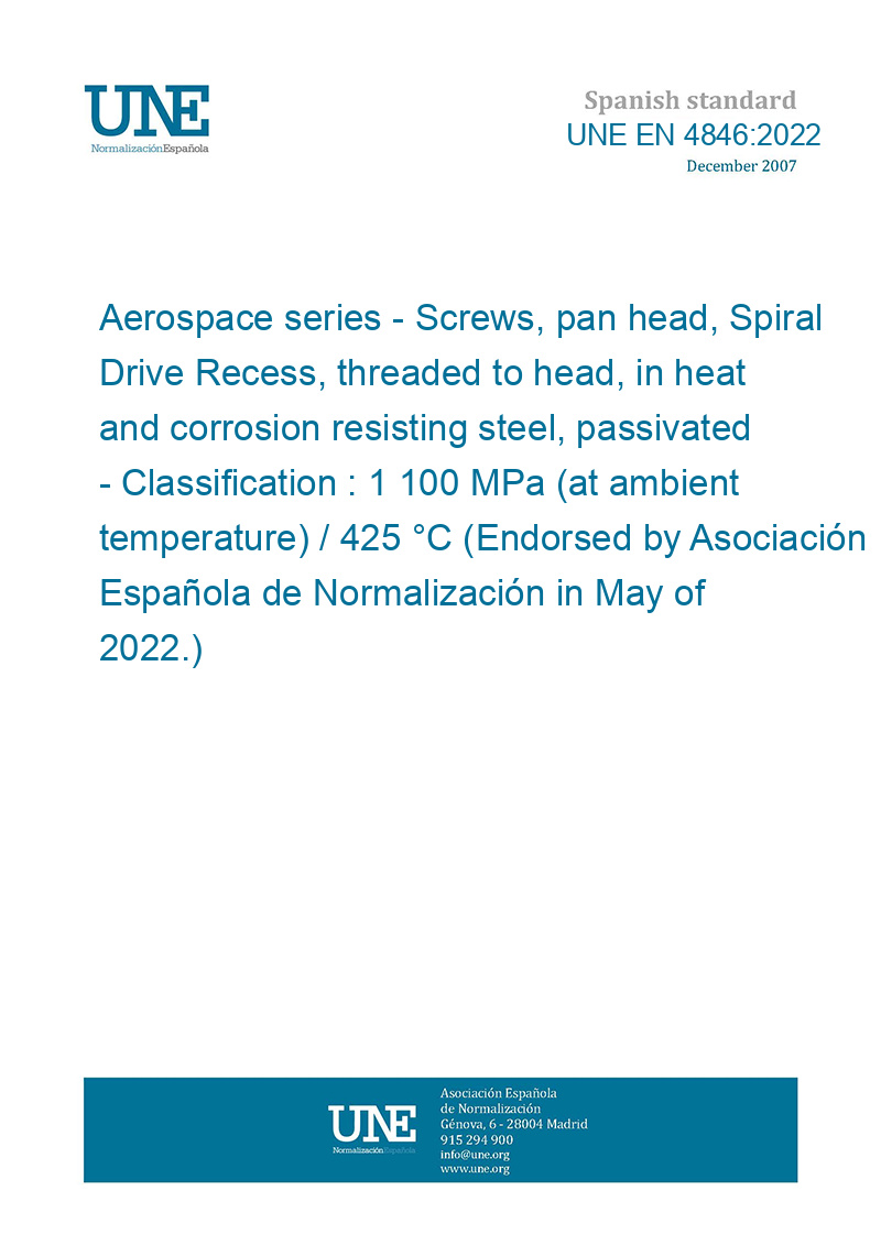 Material aeroespacial. Tornillos de cabeza cilíndrica, impresiones en espiral, roscados hasta la cabeza, en acero resistente al calor y a la corrosión, pasivados. Clasificación: 1 100 MPa (a temperatura ambiente)/425 °C (Ratificada por la Asociación Española de Normalización en mayo de 2022.)