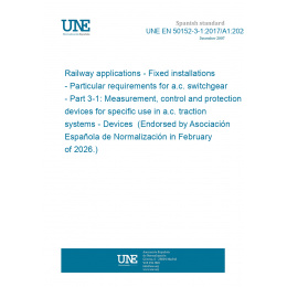 Aplicaciones ferroviarias. Instalaciones fijas. Requisitos particulares para aparamenta de corriente alterna. Parte 3-1: Dispositivos de medida, control y protección de uso específico en sistemas de tracción de corriente alterna. Dispositivos. (Ratificada por la Asociación Española de Normalización en febrero de 2026.)