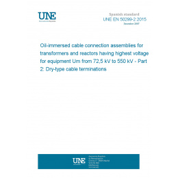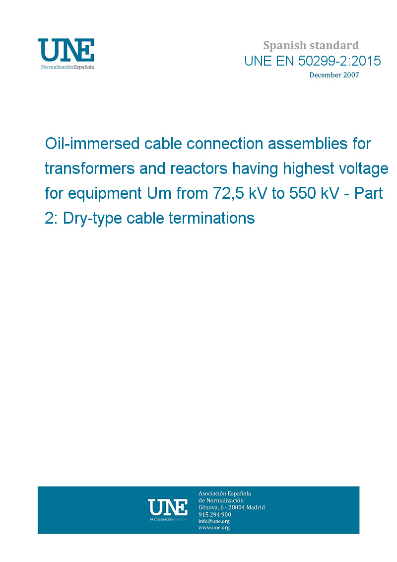 Esta norma europea se aplica a los conjuntos de conexión monofásicos sumergidos en aceite de cables para transformadores y reactancias, diseñados de acuerdo con la serie de Normas EN 60076. NOTA El término "transformador" se utiliza como definición común para transformador y reactancia. Si no se utiliza caja de conexión de cable separada y las terminaciones de cable de tipo seco se instalan directamente dentro de la cuba del transformador, se deberían seguir los requisitos de esta norma. El objeto de la Norma EN 50299-2 es establecer para las cajas de cables: " los requisitos eléctricos y mecánicos, incluyendo la intercambiabilidad; " los límites de suministro; " el ensayo a realizar. Esta norma complementa y modifica, si es necesario, las normas correspondientes y se aplica a terminaciones de cable de tipo seco para cables de potencia con aislamiento extruido que se pueden utilizar con interconexiones similares para la entrada de cable en aplicaciones de aparamenta de acuerdo con la Norma EN 62271-209. Esta norma se aplica a las cajas de conexión de cables sumergidas en aceite en transformadores con tensión más elevada para el material Um desde 72,5 kV hasta 550 kV, incluyendo el terminal conductor de corriente con conexión desmontable entre el transformador y la terminación de cable de tipo seco.