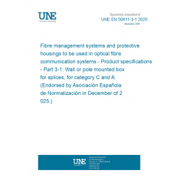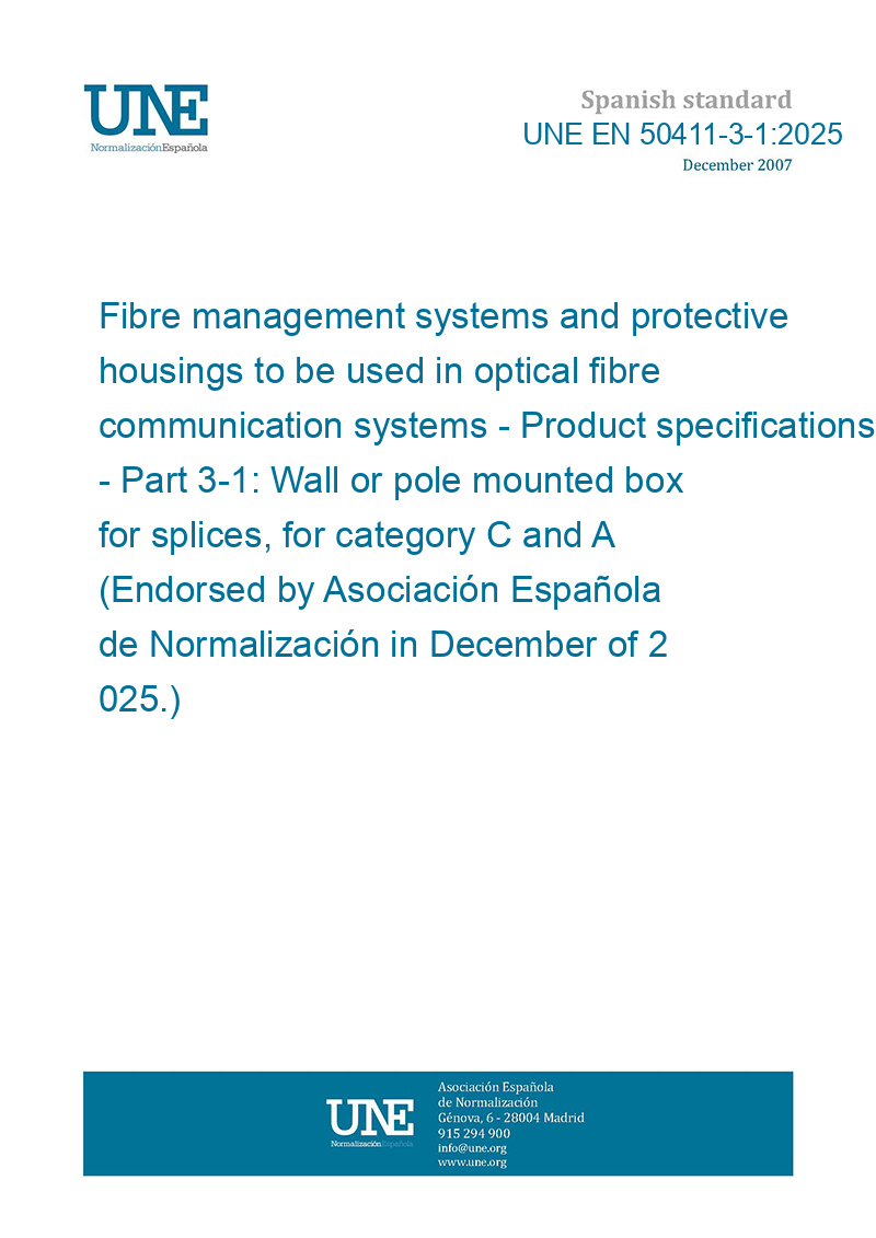 Sistemas de conducción de fibras y envolventes de protección usados en sistemas de comunicación con fibra óptica. Especificaciones de producto. Parte 3-1: Caja para empalmes para montaje en pared o poste, para categorías C y A (Ratificada por la Asociación Española de Normalización en diciembre de 2025.)