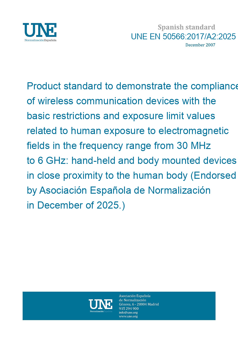 Product standard to demonstrate the compliance of wireless communication devices with the basic restrictions and exposure limit values related to human exposure to electromagnetic fields in the frequency range from 30 MHz to 6 GHz: hand-held and body mounted devices in close proximity to the human body (Endorsed by Asociación Española de Normalización in December of 2025.)