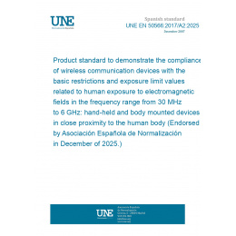 Norma de producto para demostrar la conformidad de los dispositivos de comunicación inalámbricos con las restricciones básicas y los valores límite de exposición relacionados con la exposición humana a campos electromagnéticos en la gama de frecuencias de 30 MHz a 6 GHz: dispositivos portátiles y montados en cuerpo muy próximos al cuerpo humano. (Ratificada por la Asociación Española de Normalización en diciembre de 2025.)