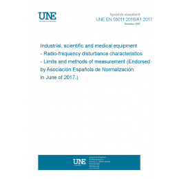 This standard UNE EN 55011:2016/A1:2017 Industrial, scientific and medical equipment - Radio-frequency disturbance characteristics - Limits and methods of measurement (Endorsed by Asociación Española de Normalización in June of 2017.) is classified in these ICS categories: