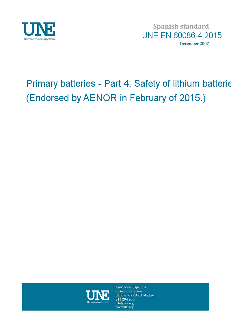 >UNE standards>UNE EN 60086-4:2015 Primary batteries - Part 4: Safety of lithium batteries (Endorsed by AENOR in February of 2015.)