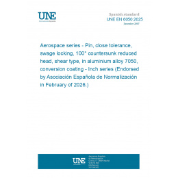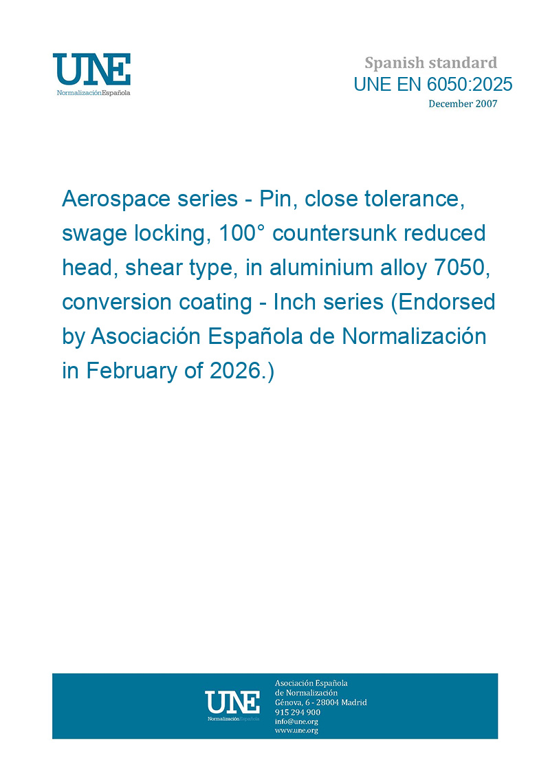 This standard UNE EN 6050:2025 Aerospace series - Pin, close tolerance, swage locking, 100° countersunk reduced head, shear type, in aluminium alloy 7050, conversion coating - Inch series (Endorsed by Asociación Española de Normalización in February of 2026.) is classified in these ICS categories:
