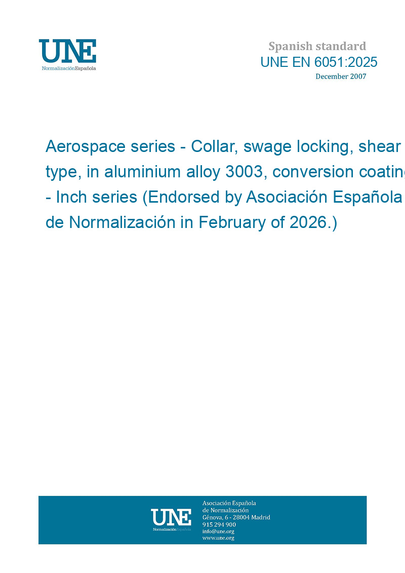 This standard UNE EN 6051:2025 Aerospace series - Collar, swage locking, shear type, in aluminium alloy 3003, conversion coating - Inch series (Endorsed by Asociación Española de Normalización in February of 2026.) is classified in these ICS categories: