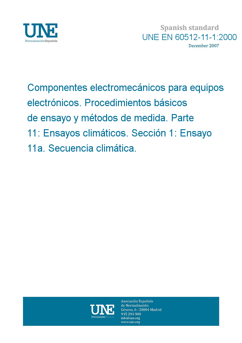 >UNE standards>UNE EN 60512-11-1:2000 ELECTROMECHANICAL COMPONENTS FOR ELECTRONIC EQUIPMENT. BASIC TESTING PROCEDURES AND MEASURING METHODS. PART 11: CLIMATIC TESTS. SECTION 1: TEST 11A. CLIMATIC SEQUENCE.