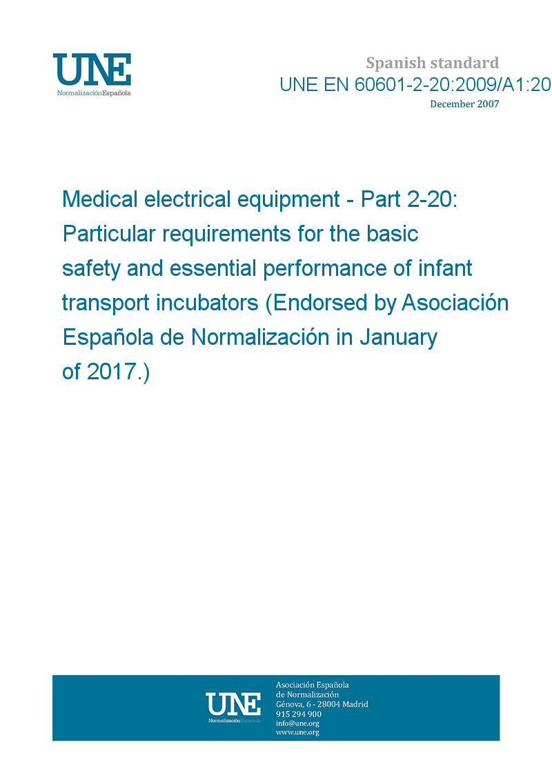 Equipos electromédicos. Parte 2-20: Requisitos particulares para la seguridad básica y funcionamiento esencial de las incubadoras de transporte de bebés. (Ratificada por la Asociación Española de Normalización en enero de 2017.)