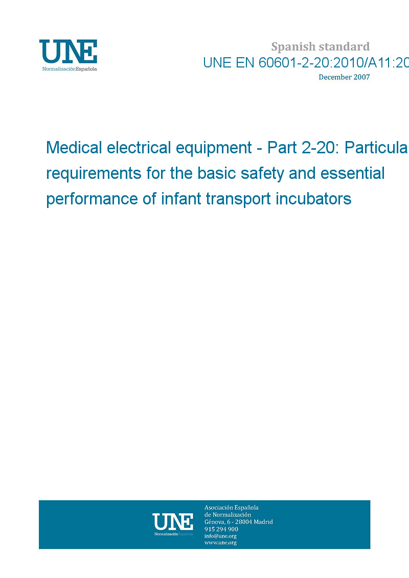 >UNE standards>UNE EN 60601-2-20:2010/A11:2012 Medical electrical equipment - Part 2-20: Particular requirements for the basic safety and essential performance of infant transport incubators