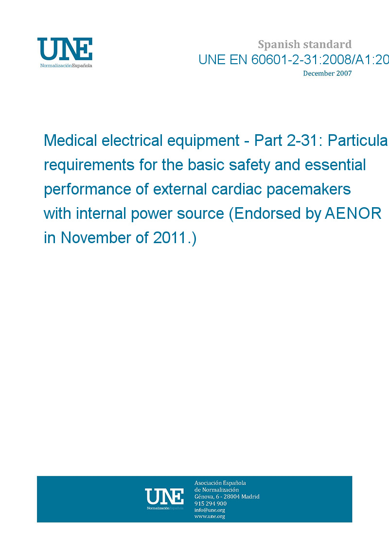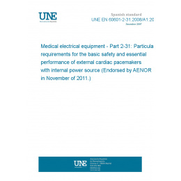 Medical electrical equipment - Part 2-31: Particular requirements for the basic safety and essential performance of external cardiac pacemakers with internal power source (Endorsed by AENOR in November of 2011.)
