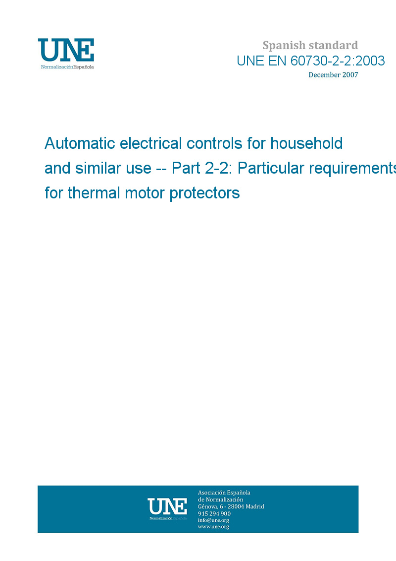 >UNE standards>UNE EN 60730-2-2:2003 Automatic electrical controls for household and similar use -- Part 2-2: Particular requirements for thermal motor protectors