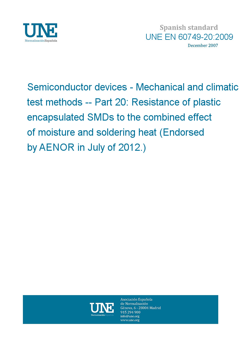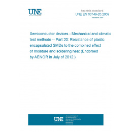 This standard UNE EN 60749-20:2009 Semiconductor devices - Mechanical and climatic test methods -- Part 20: Resistance of plastic encapsulated SMDs to the combined effect of moisture and soldering heat (Endorsed by AENOR in July of 2012.) is classified in these ICS categories: