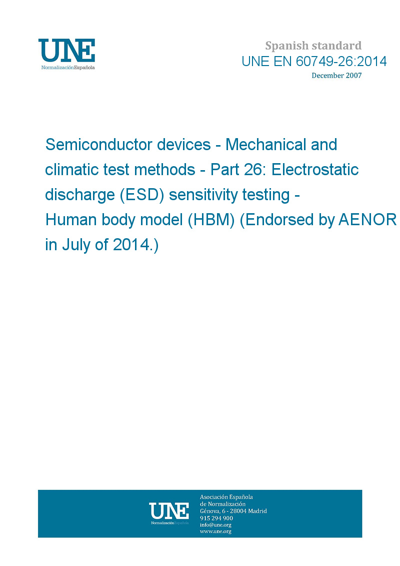 Dispositivos de semiconductores. Métodos de ensayo mecánicos y climáticos. Parte 26: Ensayo de la sensibilidad a la descarga electrostática (ESD). Modelo del cuerpo humano (HBM) (Ratificada por AENOR en julio de 2014.)