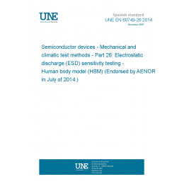This standard UNE EN 60749-26:2014 Semiconductor devices - Mechanical and climatic test methods - Part 26: Electrostatic discharge (ESD) sensitivity testing - Human body model (HBM) (Endorsed by AENOR in July of 2014.) is classified in these ICS categories: