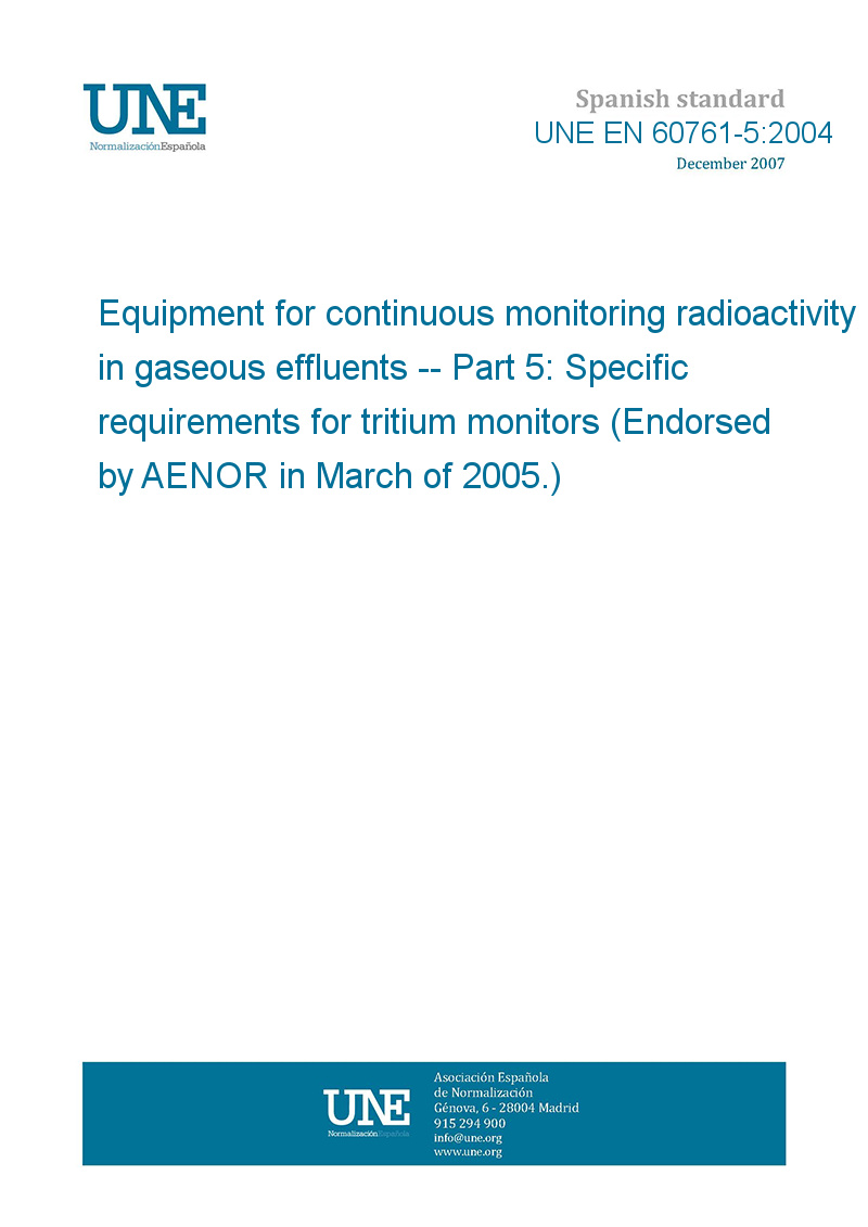 This standard UNE EN 60761-5:2004 Equipment for continuous monitoring radioactivity in gaseous effluents -- Part 5: Specific requirements for tritium monitors (Endorsed by AENOR in March of 2005.) is classified in these ICS categories: