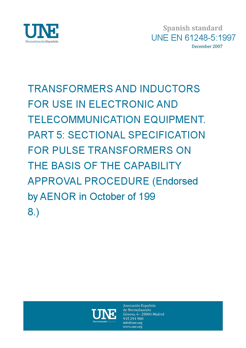 Transformadores e inductancias para equipos electrónicos y de telecomunicación. Parte 5: Especificación intermedia para los transformadores de pulso sobre la base del procedimiento de aprobación de la capacitación. (Ratificada por AENOR en octubre de 1998.)