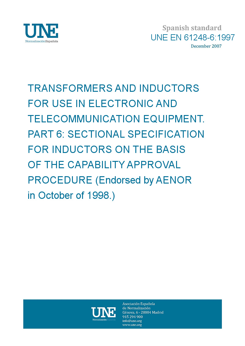 Transformadores e inductancias para equipos electrónicos y de telecomunicación. Parte 6: Especificación intermedia para inductancias sobre la base del procedimiento de aprobación de la capacitación. (Ratificada por AENOR en octubre de 1998.)