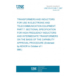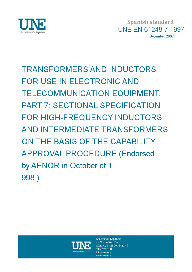 Transformadores e inductancias para equipos electrónicos y de telecomunicación.Parte 7: Especificación intermedia para inductores de alta frecuencia y transformadores de frecuencia intermedia sobre la base del procedimiento de aprobación de la capacitación. (Ratificada por AENOR en octubre de 1998.)