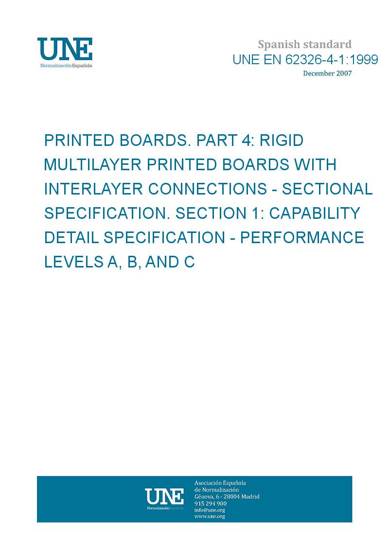 Tarjetas impresas. Parte 4: Tarjetas con circuito impreso multicapa rígidas con conexiones entre las capas. Especificación intermedia. Sección 1: Especificación particular de competencia. Niveles de funcionamiento A, B, C.