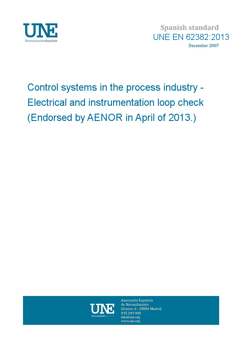 This standard UNE EN 62382:2013 Control systems in the process industry - Electrical and instrumentation loop check (Endorsed by AENOR in April of 2013.) is classified in these ICS categories:
