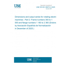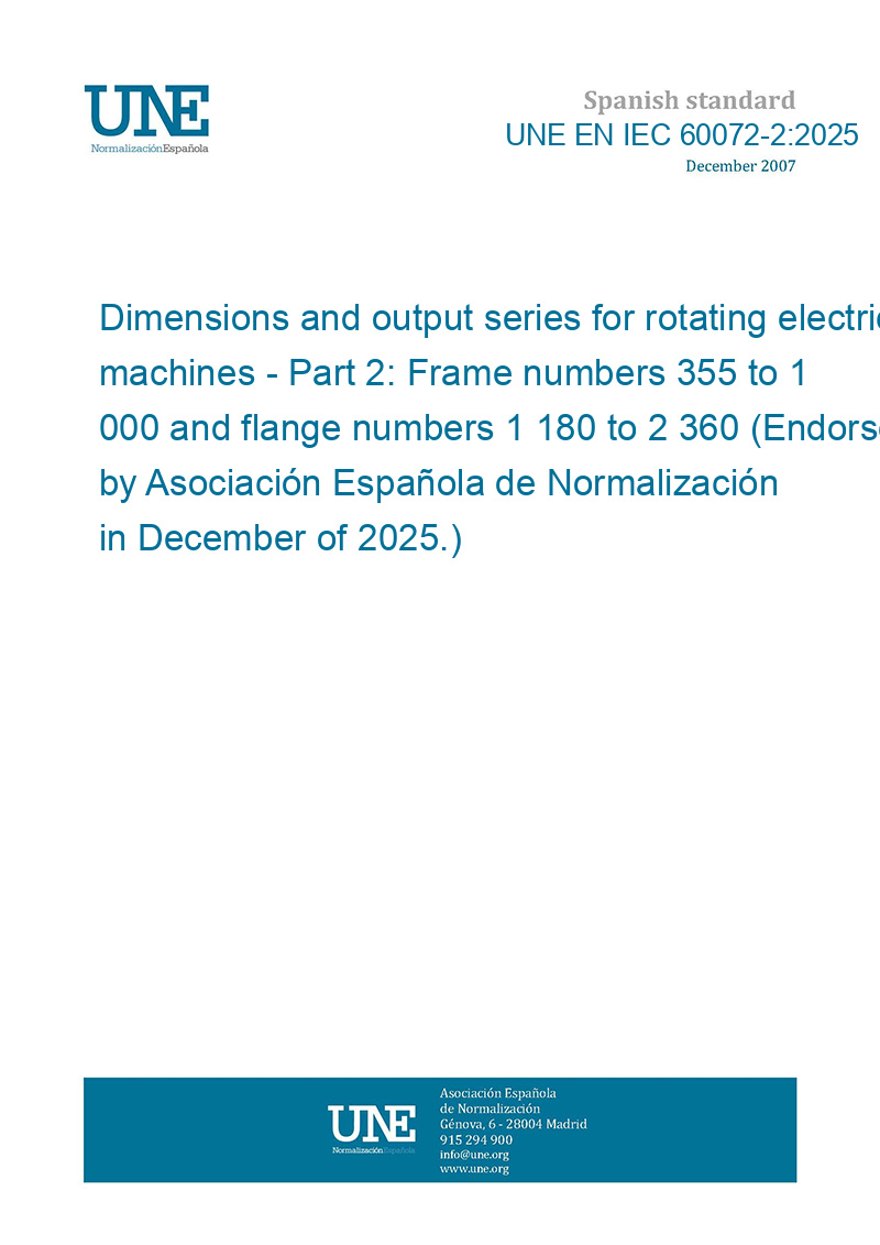 Dimensiones y series de salida para máquinas eléctricas rotativas. Parte 2: Números de bastidor entre 355 y 1000 y números de brida entre 1180 y 2360. (Ratificada por la Asociación Española de Normalización en diciembre de 2025.)