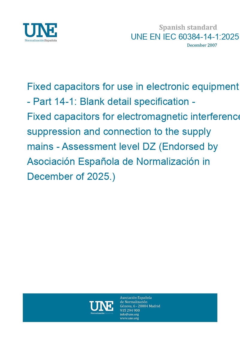 Condensadores fijos para uso en equipos electrónicos. Parte 14-1: Especificación marco particular: Condensadores fijos para supresión de interferencias electromagnéticas y conexión a la red de alimentación. Nivel de evaluación DZ (Ratificada por la Asociación Española de Normalización en diciembre de 2025.)