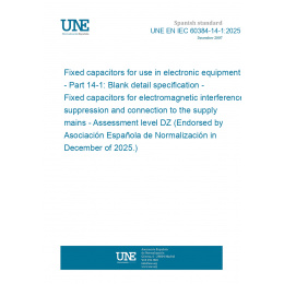 Fixed capacitors for use in electronic equipment - Part 14-1: Blank detail specification - Fixed capacitors for electromagnetic interference suppression and connection to the supply mains - Assessment level DZ (Endorsed by Asociación Española de Normalización in December of 2025.)