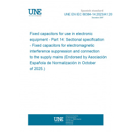 Condensadores fijos para uso en equipos electrónicos. Parte 14: Especificación intermedia: Condensadores fijos para supresión de interferencias electromagnéticas y conexión a la red de alimentación. (Ratificada por la Asociación Española de Normalización en octubre de 2025.)
