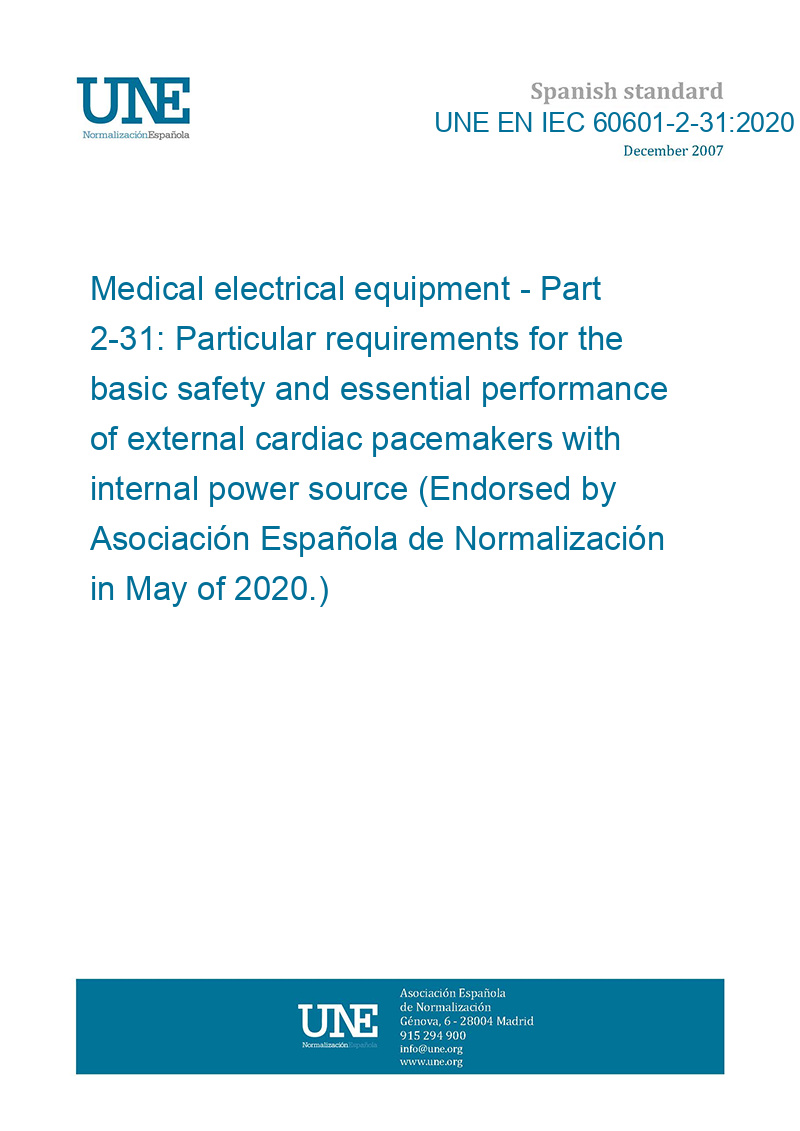 Equipos electromédicos. Parte 2-31: Requisitos particulares para la seguridad básica y funcionamiento esencial de marcapasos externos cardiacos con fuente de alimentación interna. (Ratificada por la Asociación Española de Normalización en mayo de 2020.)