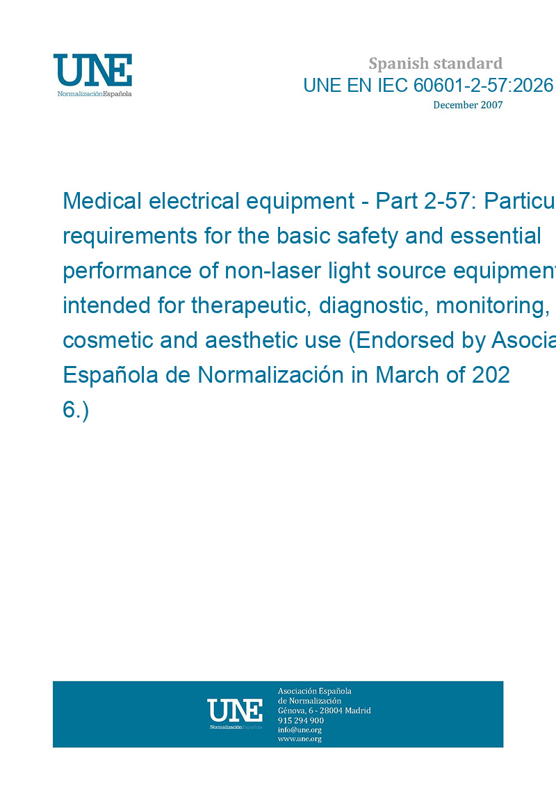 Equipos electromédicos. Parte 2-57: Requisitos particulares para la seguridad básica y el funcionamiento esencial de los equipos cuya fuente luminosa no es un láser utilizados para uso terapéutico, diagnóstico, monitorización y cosmética/estética. (Ratificada por la Asociación Española de Normalización en marzo de 2026.)