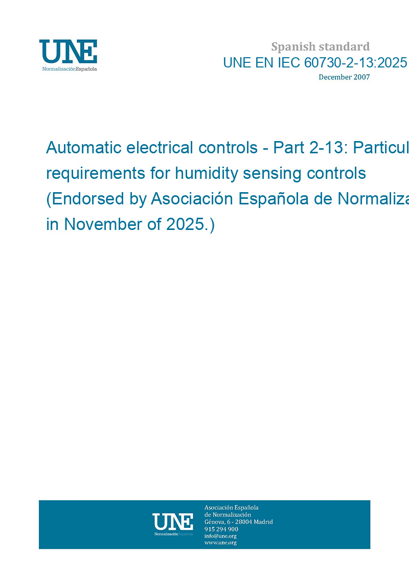 Dispositivos de control eléctrico automático. Parte 2-13: Requisitos particulares para dispositivos de control sensibles a la humedad. (Ratificada por la Asociación Española de Normalización en noviembre de 2025.)