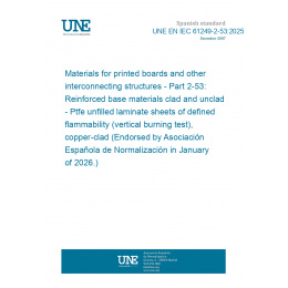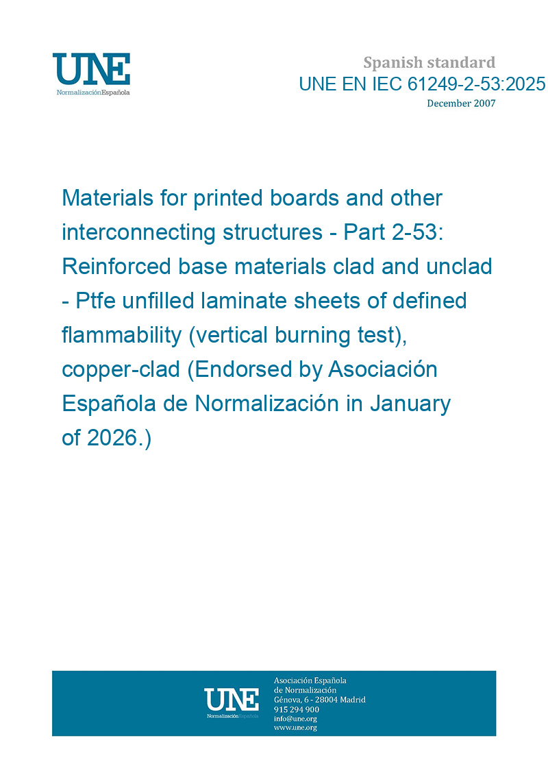 Materiales para placas impresas y otras estructuras de interconexión. Parte 2-53: Materiales de base reforzados, con y sin revestimiento. Láminas laminadas de PTFE sin relleno de inflamabilidad definida (ensayo de combustión vertical), revestidas de cobre. (Ratificada por la Asociación Española de Normalización en enero de 2026.)
