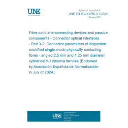 Dispositivos de interconexión de fibra óptica y componentes pasivos. Interfaces ópticas de conectores de fibra óptica. Parte 3-2: Parámetros de conectores para fibras monomodo de dispersión no desplazada en contacto físico. Férula de circonia completa cilíndrica con ángulo de 2´5 mm y 1´25 mm de diámetro. (Ratificada por la Asociación Española de Normalización en julio de 2024.)